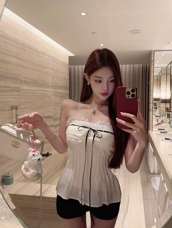 女性らしいベアトップに、トレンドのリボンデザインとガーリーなレースデザインをプラスしたベアトップス♡