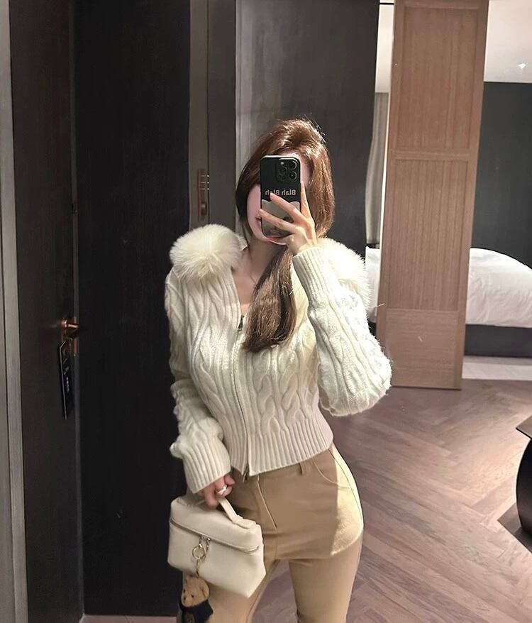 ♡ リアルフォックスファーフード付きクロップド丈ニットパーカー♡