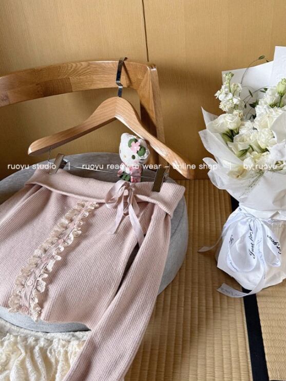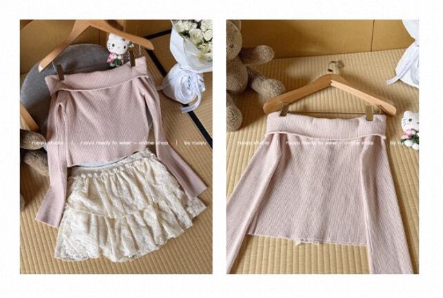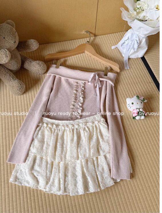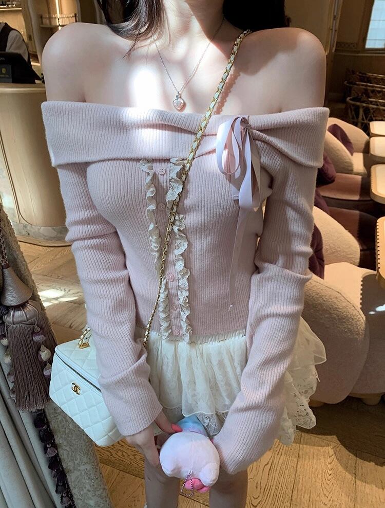 オフショルダーの折り返しデザインにリボンをつけ、フロントにはレースがポイントの伸縮性のあるリブニットトップス♡