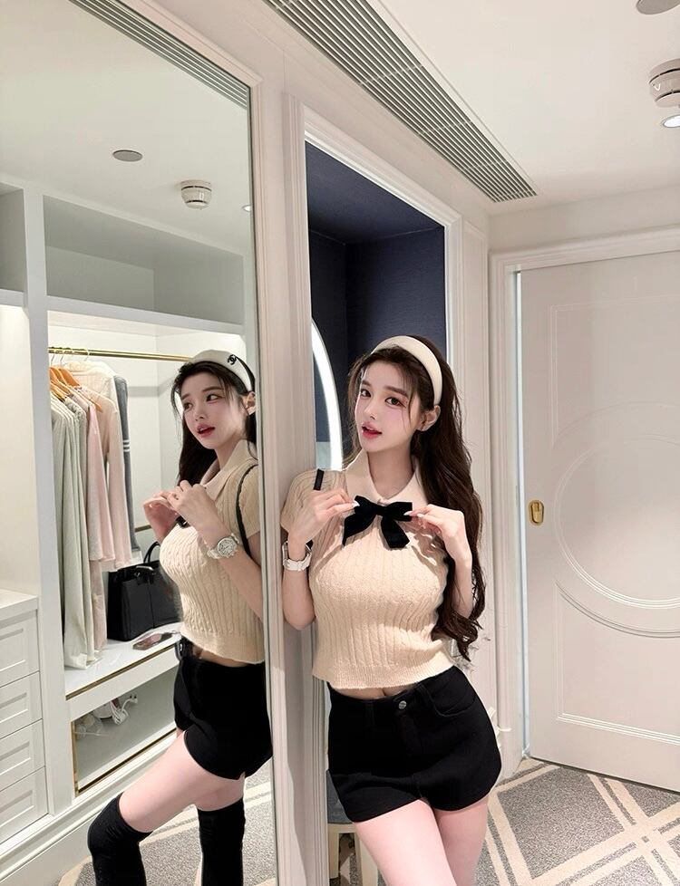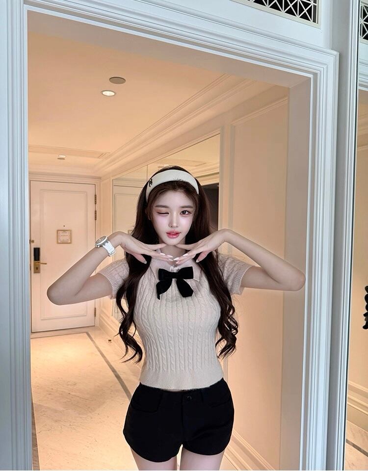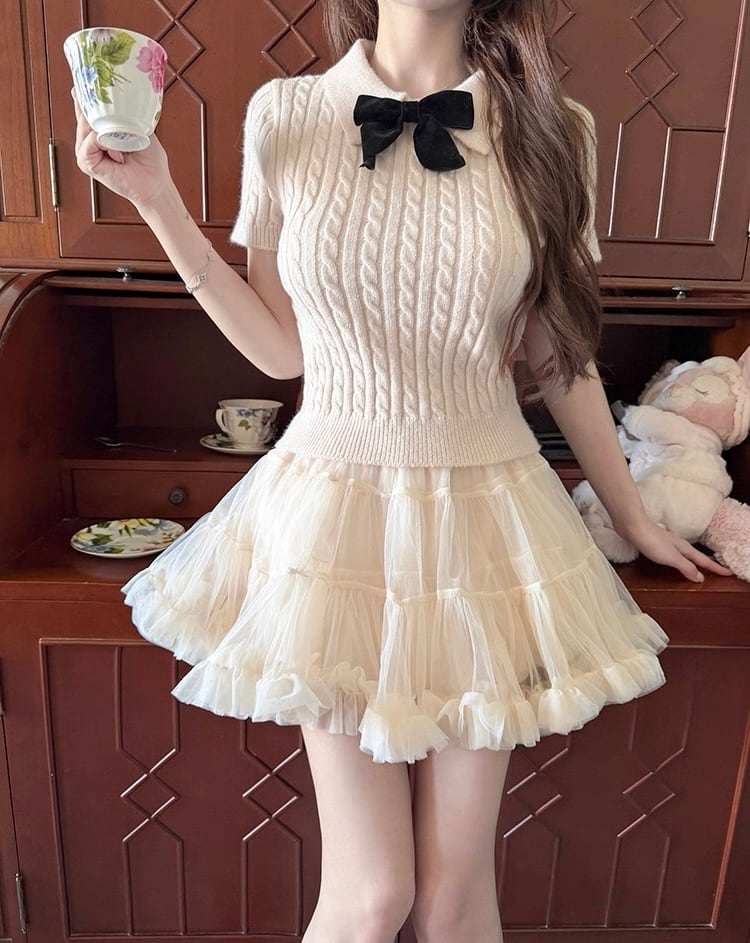 リボン付きケーブル編み半袖ニットトップス