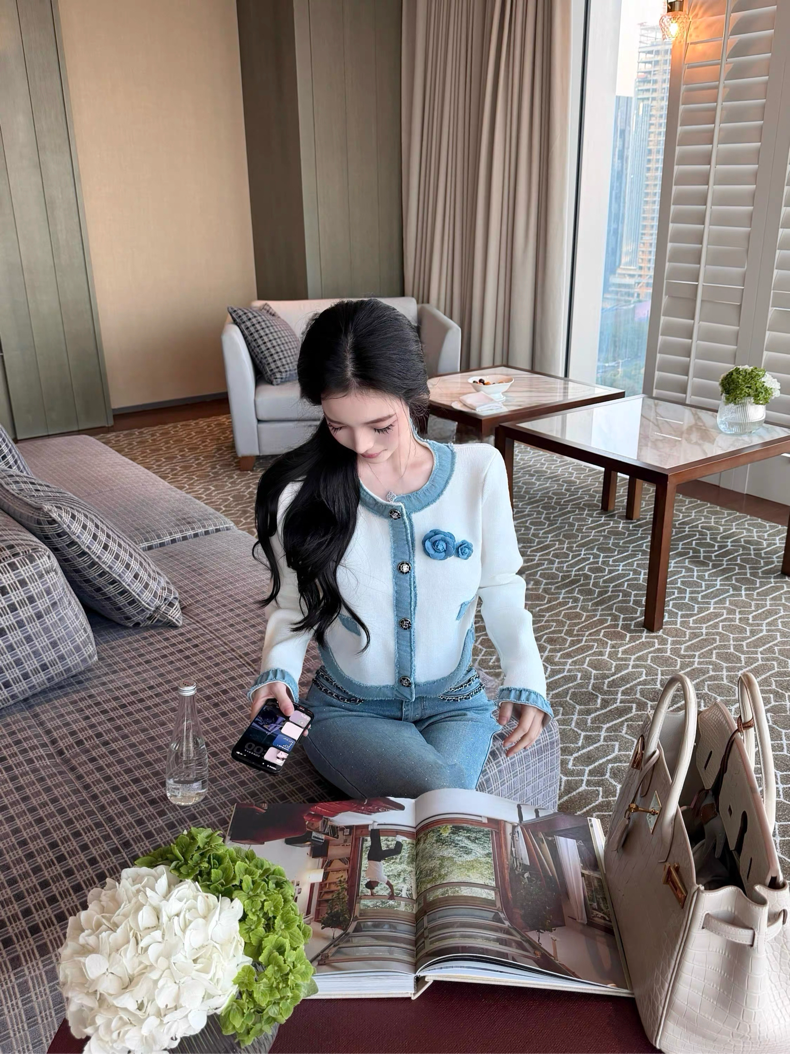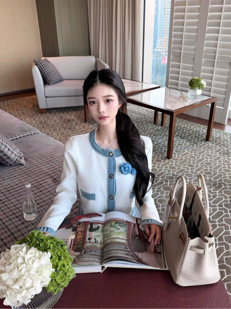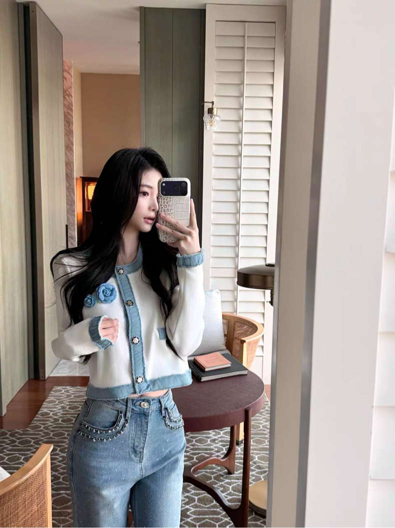 やわらかなホワイトニットをベースに、縁取りやポケット部分にあしらわれたデニム生地のくすみブルーの配色がアクセントになり、洗練された印象を演出したカーディガン♡
