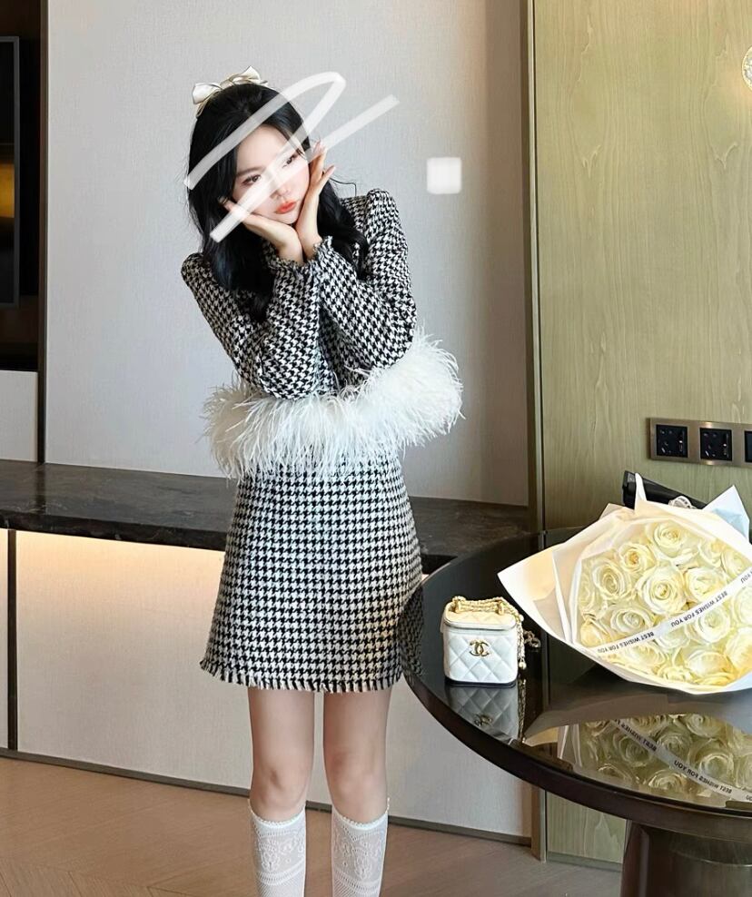 フェザー付きツイードトップス×ツイードスカートセットアップ