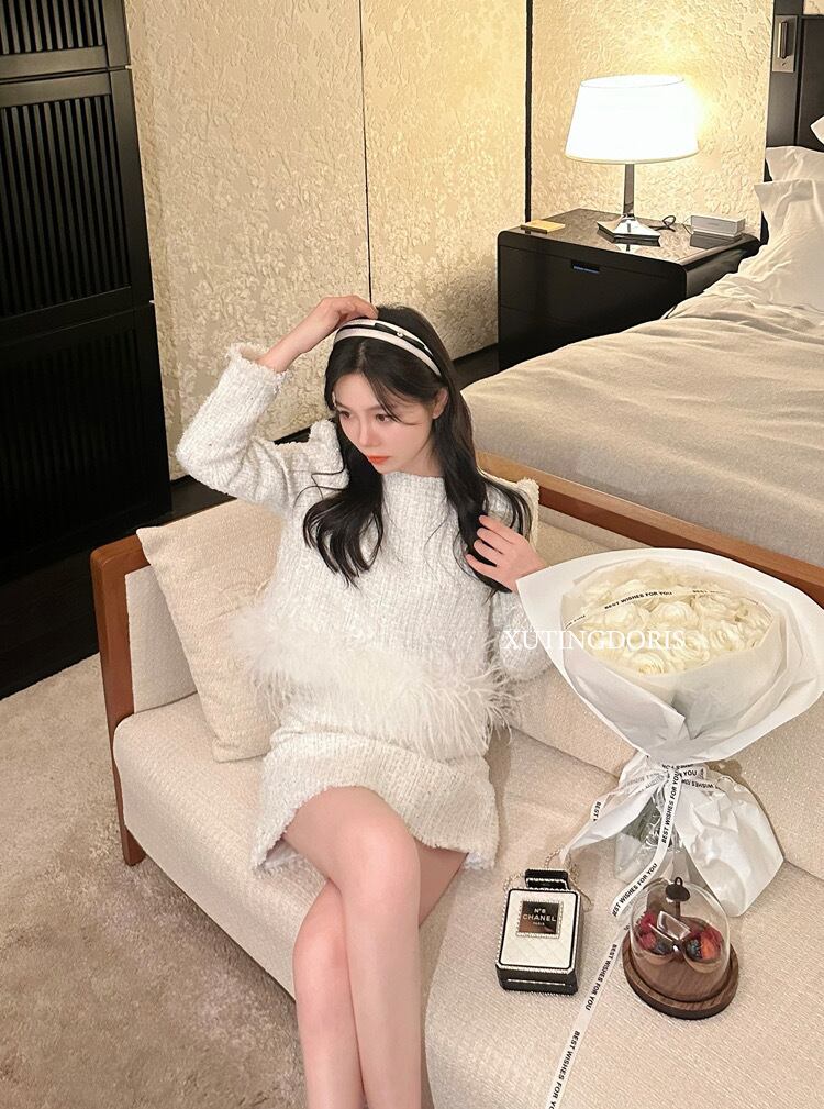 エレガントなフェザー付きのトップスとスカートのセットアップ♡