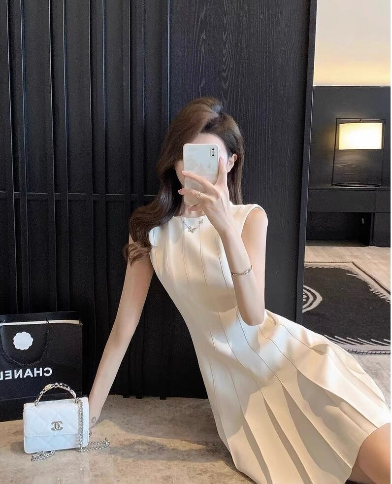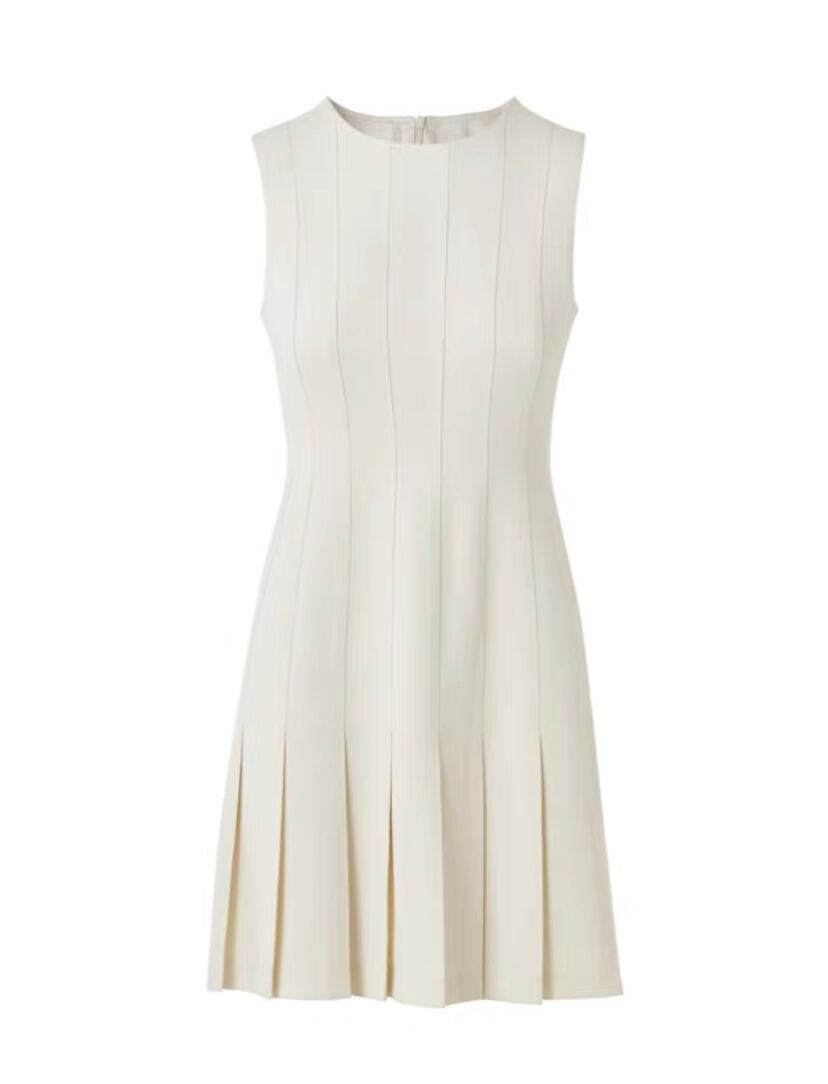 Uネックにノースリーブでスッキリと甘さを抑えた印象に