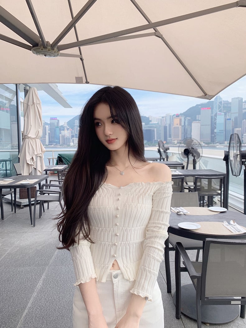 フロントのパールボタンがポイントの女っぽさ高まるオフショルニットトップス♡