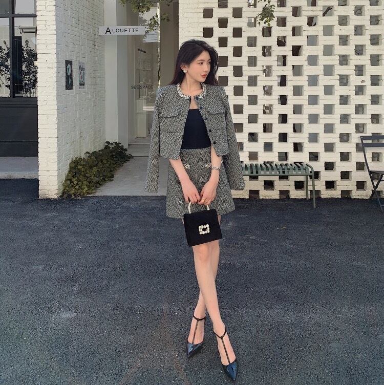 ビジュー付きヘリンボーン柄セットアップ