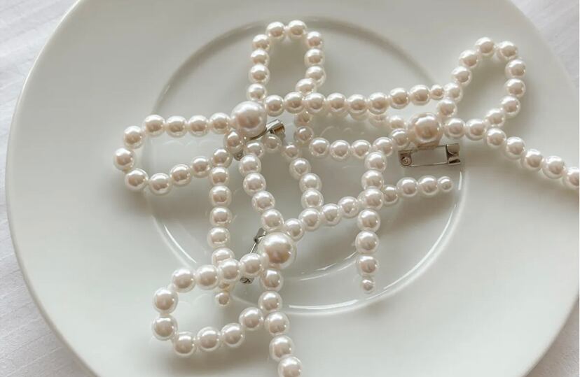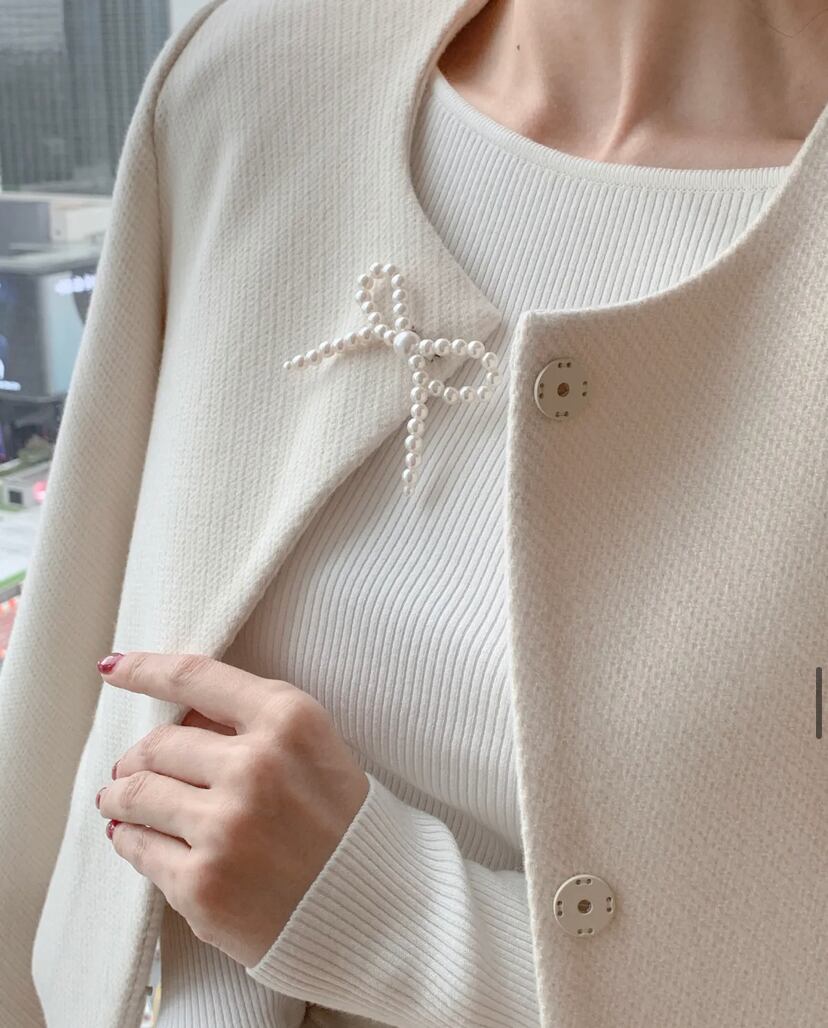 パールリボンブローチはボタンに合わせて3段につけても、ポケット部分につけても、ワンポイントでつけても・・♡