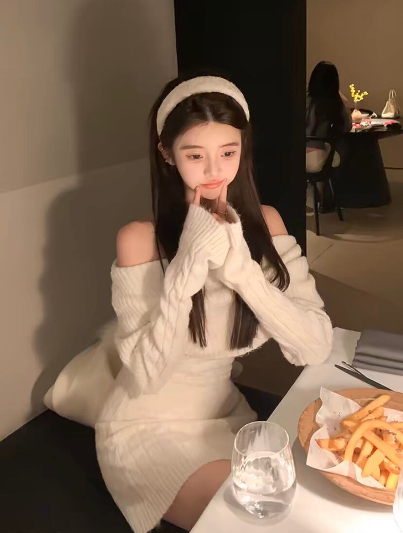 オフショルダーケーブル編みニットフレアワンピース